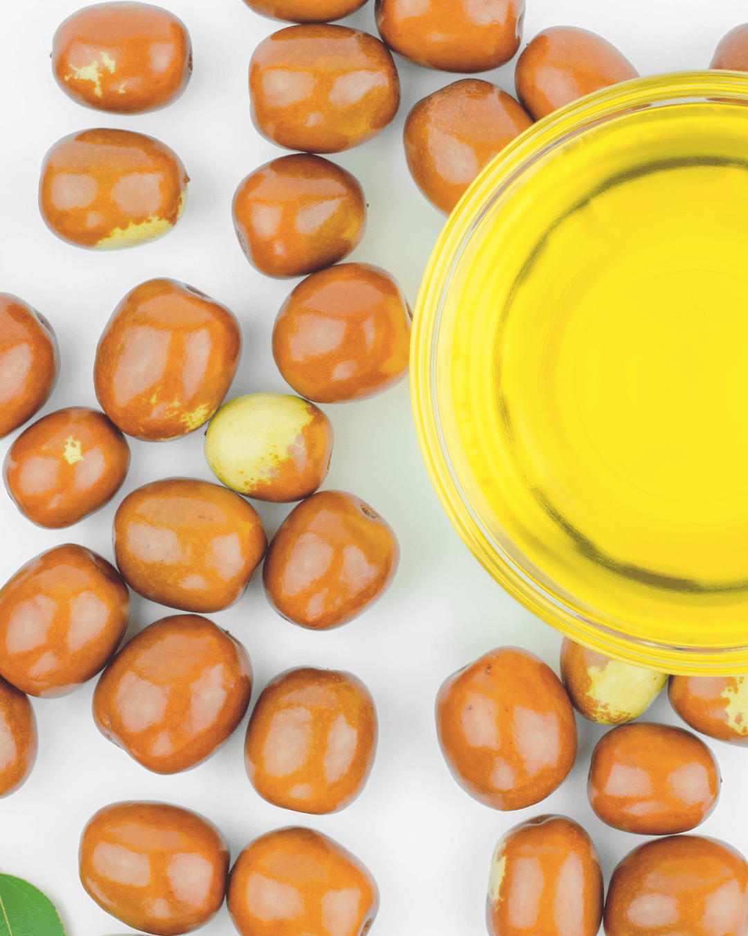Semelhante ao sebo natural da pele, esse óleo ajuda a equilibrar a produção de óleo e mantendo a hidratação sem obstruir os poros e de forma gentil. Rico em vitaminas A e E, ácidos graxos essenciais e ceramidas, que aumentam a capacidade de retenção de água na pele contribuindo para hidratação cutânea e suavidade. Rico também em ácido mirístico, que atua no fortalecimento da barreira protetora da pele e possui propriedades lubrificantes, aumentando a penetração de outros componentes. Esse ativo possui propriedades antibacterianas, que auxiliam no tratamento de acne e outras irritações cutâneas, sendo ideal para todos os tipos de pele, inclusive as oleosas.